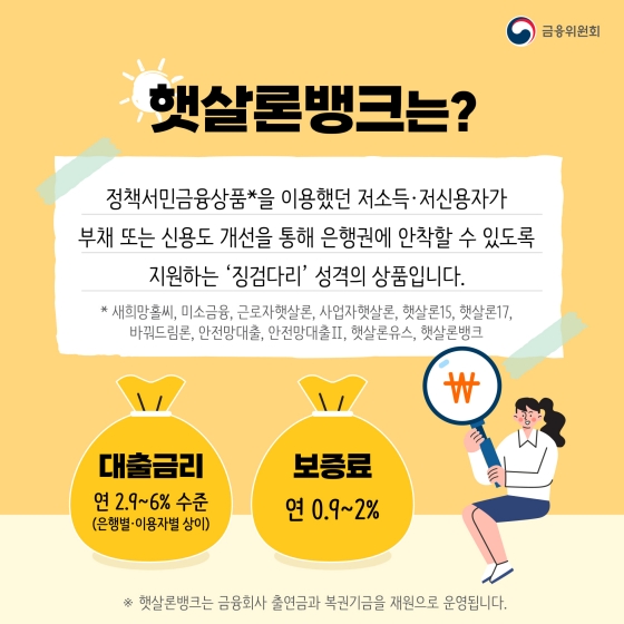| 햇살론 뱅크 | 정책서민금융상품을 현재 6개월 이상 이용 중(또는 정상 완제 후 3년이 안 된 사람)이면서 부채 또는 신용도가 개선된 저소득 저신용자: 최대 2,500만원을 3년 또는 5년 동안 연 2.9~ 6%대로 대출 지원. ※ 새희망홀씨,미소금융,근로자햇살론,사업자햇살론,햇살론15,바꿔드림론,안전망대출II,햇살론유스, 햇살론 뱅크 |