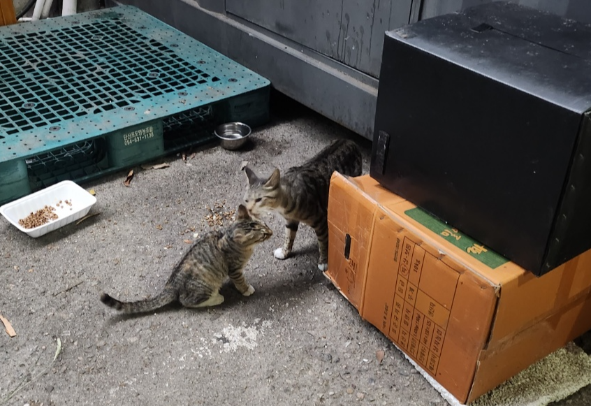 콘테이너 박스 위에서 아기고양이를 찾아 헤매던 어미고양이는 반가운 마음으로 뛰어내려 아기고양이와 재회를 하며 부둥켜 안고 입맞춤하는 모습에서 사람의 아기와 엄마의 모습을 연상하며 애틋한 마음이 되었다.