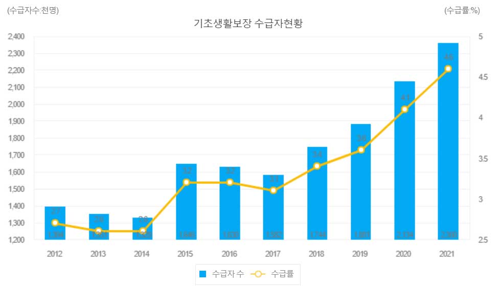 * (연도별 기준 중위소득 증가율)을 보면 ('16) 4.00% → ('17) 1.73% → ('18) 1.16% → ('19) 2.09% → ('20) 2.94% → ('21) 2.68% → ('22) 5.02% → ('23) 5.47%로 증가되었습니다.