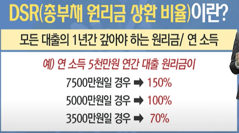 바로 '총부채원리금상환비율'즉 스트레스 DSR 3단계가 7월부터 전면 시행되는 '총부채원리금상환비율' 제도는 갖고 있는 모든 대출,예를 들어 주택담보대출,신용대출,카드론 등 모든 대출의 연간 원리금 상환액 소득의 일정 비율 넘으면 추가 대출 사실상 막히는 제도입니다.